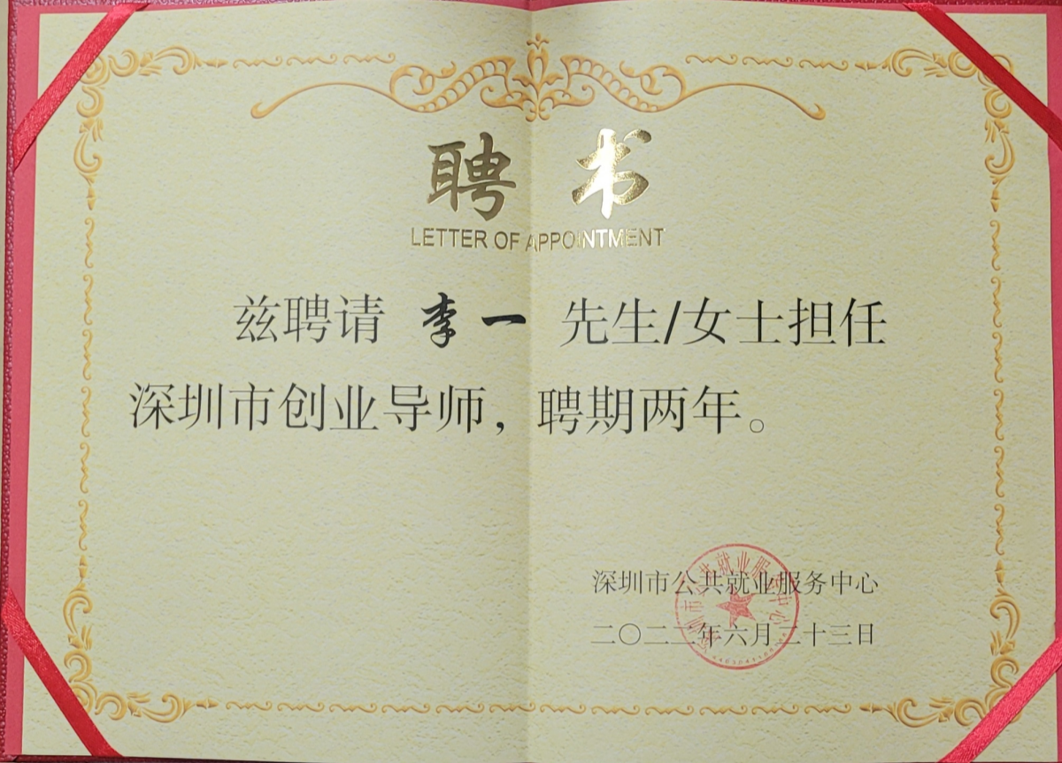 项目负责人李一博士获聘深圳市创业导师